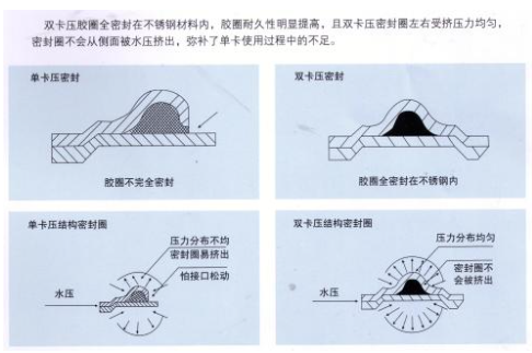雙卡壓式膠圈密封在不銹鋼材料內(nèi),膠圈耐久性明顯提高,且雙卡壓密封圈左右受擠壓均勻,密封圈不會(huì)從側(cè)面倍水壓擠出,彌補(bǔ)了單卡壓適用過程中的不足。