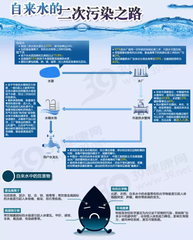 自來(lái)水的污染源有很多,其中大的污染源來(lái)源于二次供水,如果您是住在高層住宅,每天打開(kāi)家中的水龍頭時(shí),您是否清楚,水龍頭流出的水其實(shí)并不是由自來(lái)水公司直接供給,而是通過(guò)小區(qū)的二次供水設(shè)備把設(shè)置在樓頂端蓄水池里的水經(jīng)過(guò)加壓后才送到您家的。