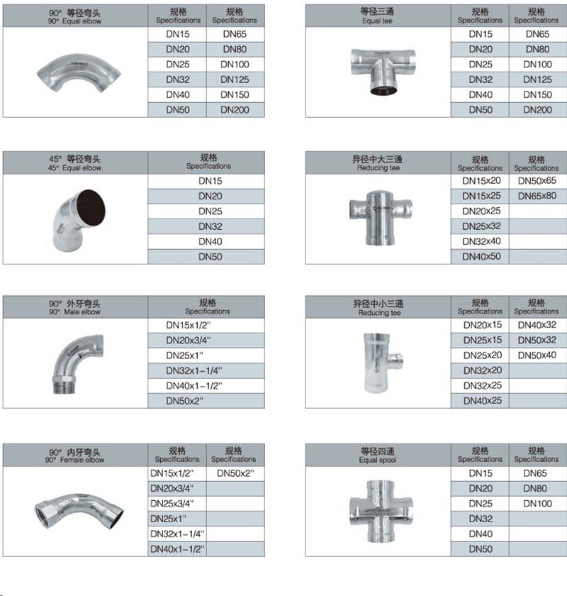 不銹鋼承插焊管件的品種包括:承插焊式45°等徑彎頭,承插焊式90°等徑彎頭,承插焊式180°等徑彎頭,承插焊式內(nèi)牙彎頭,承插焊式外牙彎頭,承插焊式異徑彎頭,承插焊式外牙三通,承插焊式內(nèi)牙三通,承插焊式等徑三通,承插焊式異徑中大三通,承插焊式異徑中小三通,承插焊式等徑四通,承插焊式異徑四通,承插焊式等徑直通,承插焊式異徑直通,承插焊式外牙直通,承插焊式內(nèi)牙直通,承插焊式過(guò)橋彎管,承插焊式管帽,承插焊式分水器等。